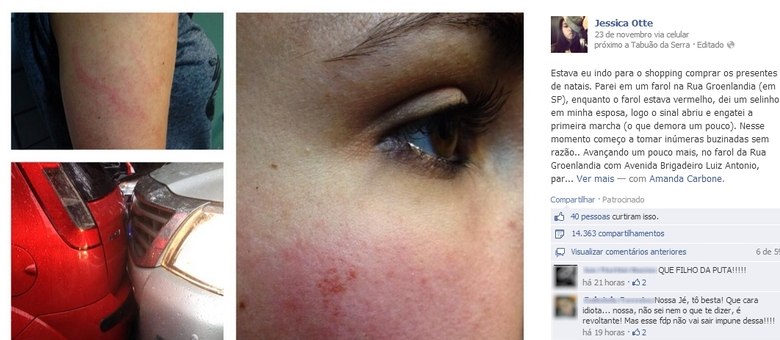 Segundo a publicitária, o motorista saiu do carro e bateu no rosto dela, além de empurrá-la. A mulher de Jéssica afirma que ela não reagiu, pôs as mãos atrás do corpo e disse: ‘Pode bater’. Outro carro parou por perto, de onde saiu a mulher do homem, que também começou a empurrá-la. As duas ligaram para a polícia e o casal fugiu. Elas os seguiram por 15 minutos, depois se encaminharam ao 14° DP (Distrito Policial) para registrar a ocorrência.
